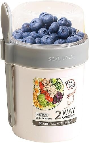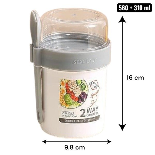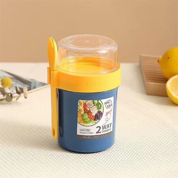 Este contenedor doble es práctico, compacto y perfecto para llevar snacks, yogur, cereales o almuerzos ligeros.