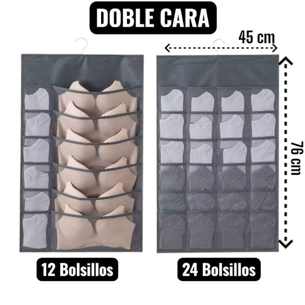 Cara trasera con 24 bolsillos, perfecta para organizar medias, ropa interior pequeña o accesorios.