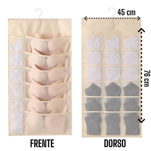 Maximizá el espacio de tu placard y mantené tu ropa interior siempre ordenada con este práctico organizador colgante. Ideal para tener todo a la vista y bien distribuido.