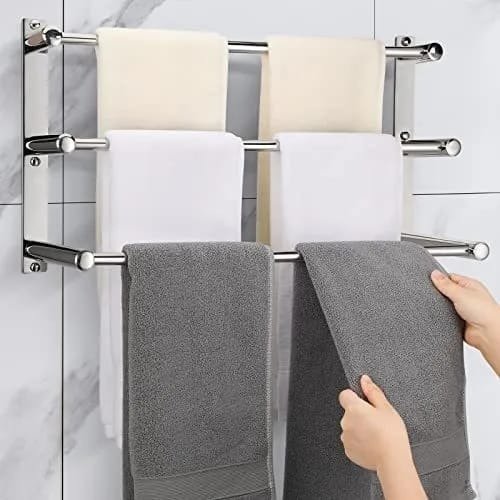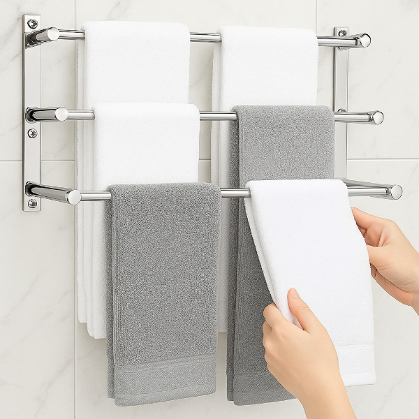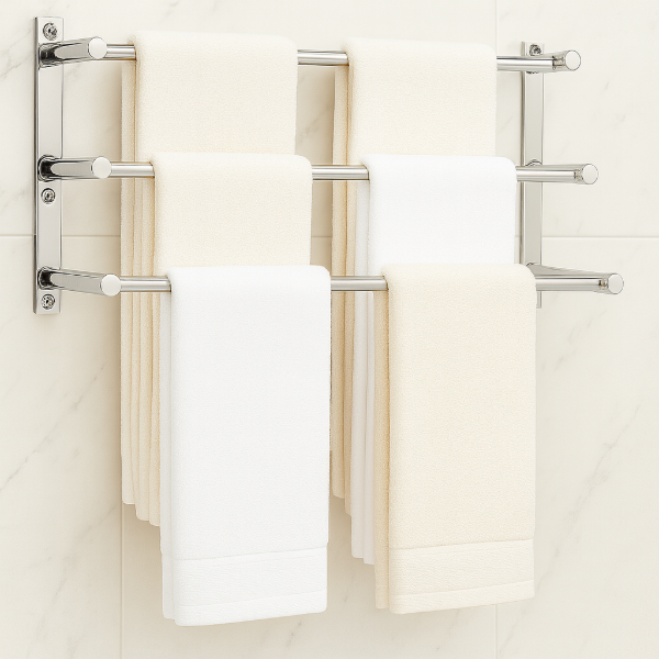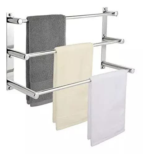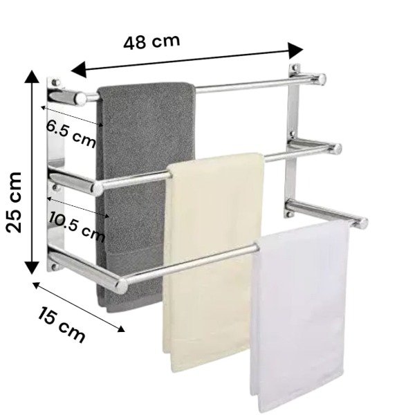 Organizá tu baño con estilo y practicidad. Este barral triple para toallones está fabricado en acero inoxidable, un material resistente a la humedad y al óxido, ideal para ambientes de baño. Su diseño de tres barras paralelas permite colgar y secar varias toallas al mismo tiempo, aprovechando al máximo el espacio disponible.