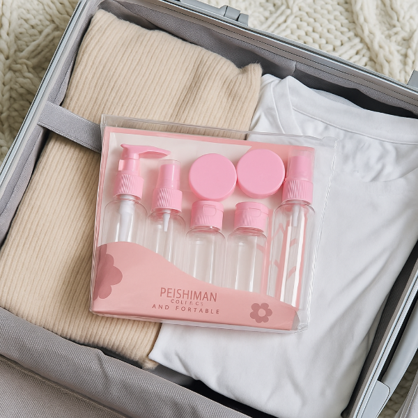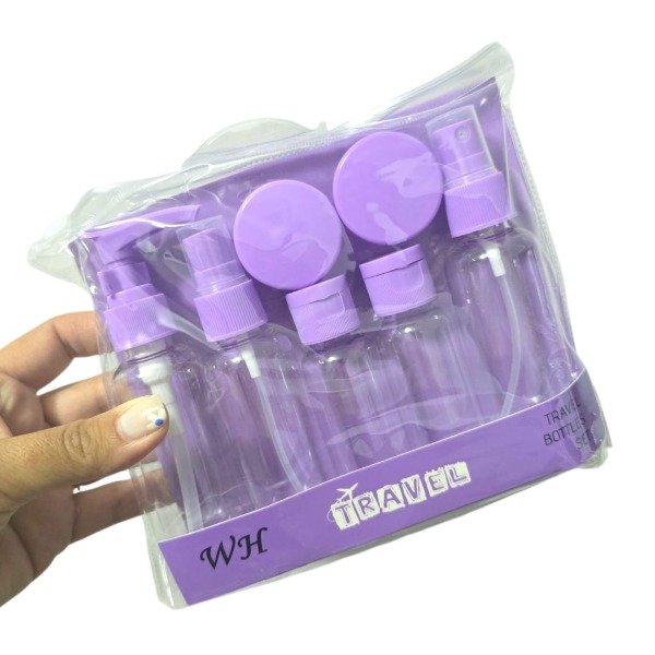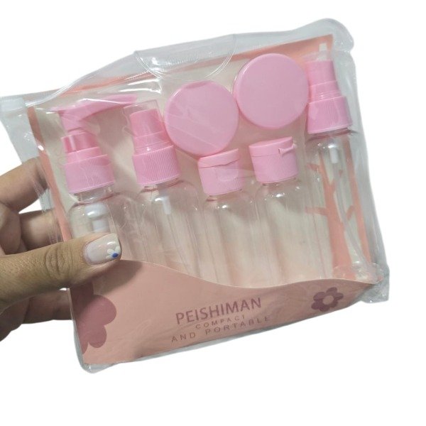 Ideal para tus viajes, este pack de 7 frascos recargables te permite llevar tus productos favoritos de cuidado personal sin ocupar espacio ni exceder los límites permitidos en cabina. Incluye: