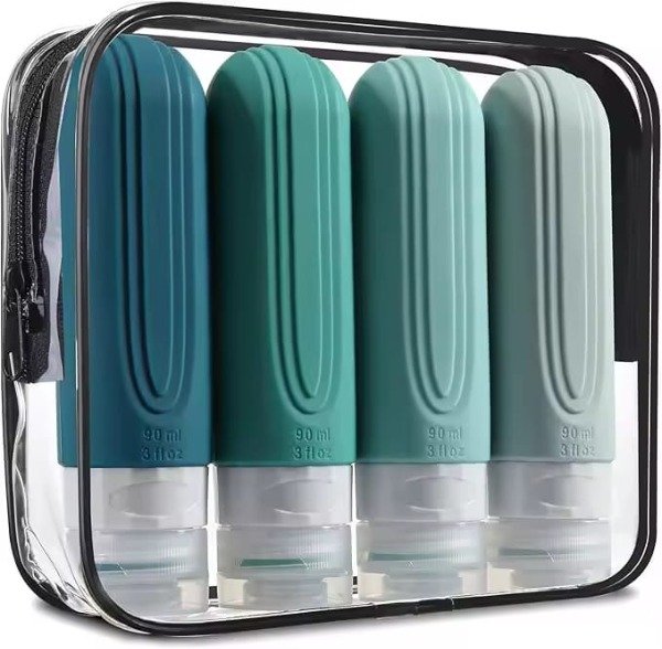 Neceser con 4 frascos de silicona recargables de 90 ml – Apto cabina avión ✈️
