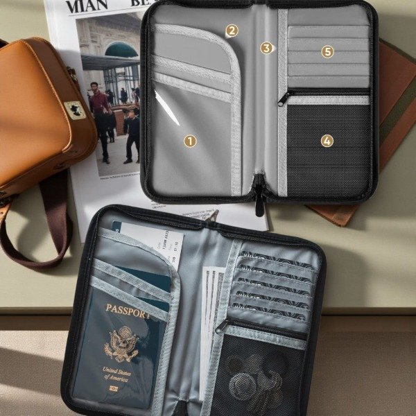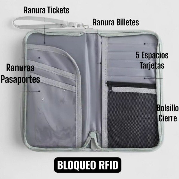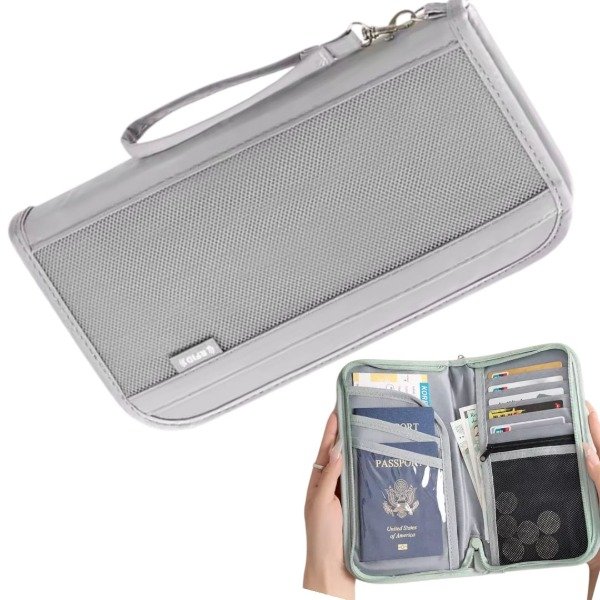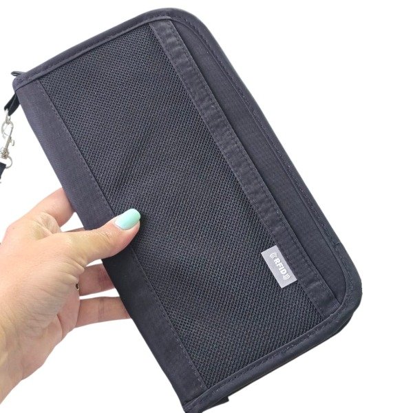 Organizador de viaje práctico y compacto, diseñado para mantener tus documentos, tarjetas y efectivo ordenados y seguros. Cuenta con bloqueador RFID integrado que protege tus tarjetas y pasaporte contra clonaciones. Ideal para viajar, pasar por seguridad en aeropuertos y llevar todo lo necesario en un solo lugar.